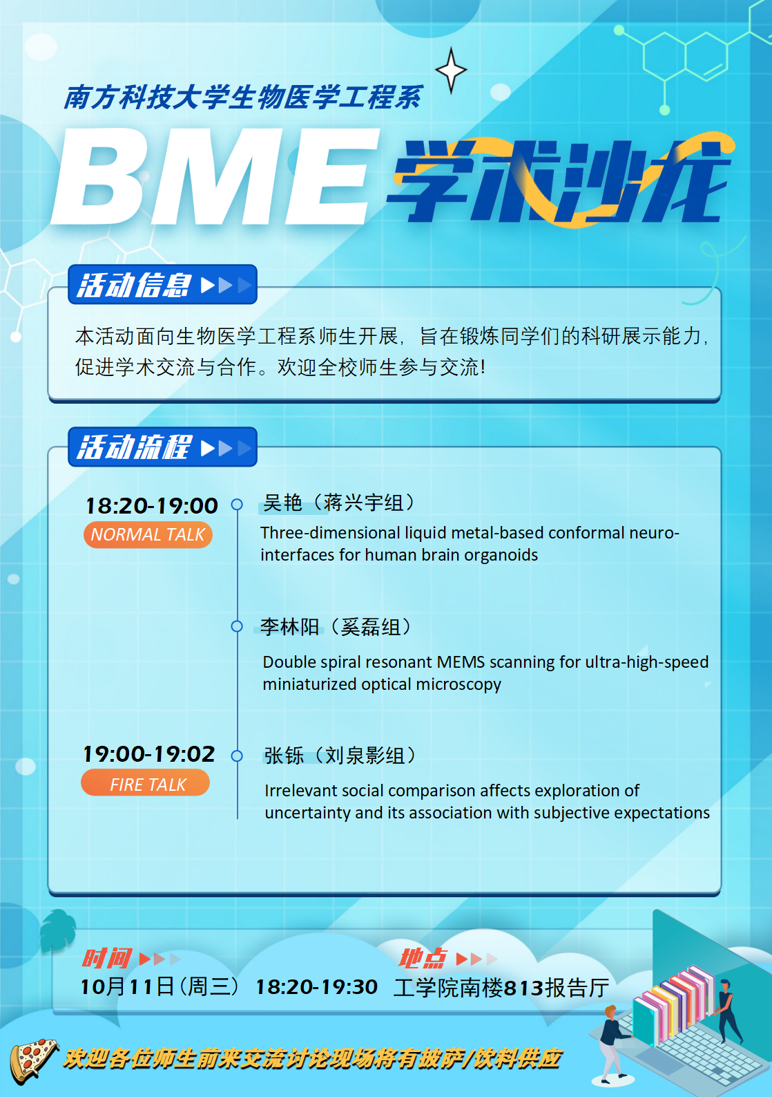 活動對象:生醫工系本科生、研究生及博士后進行學術分享,歡迎全校師生參與交流