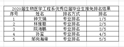 生物醫學工程系2020屆優秀應屆畢業生免試攻讀研究生排名結果公示如下,公示期2019年8月19日-2019年8月23日,如有異議,請聯系王老師,0755-88015001,wangd3@sustech.edu.cn.