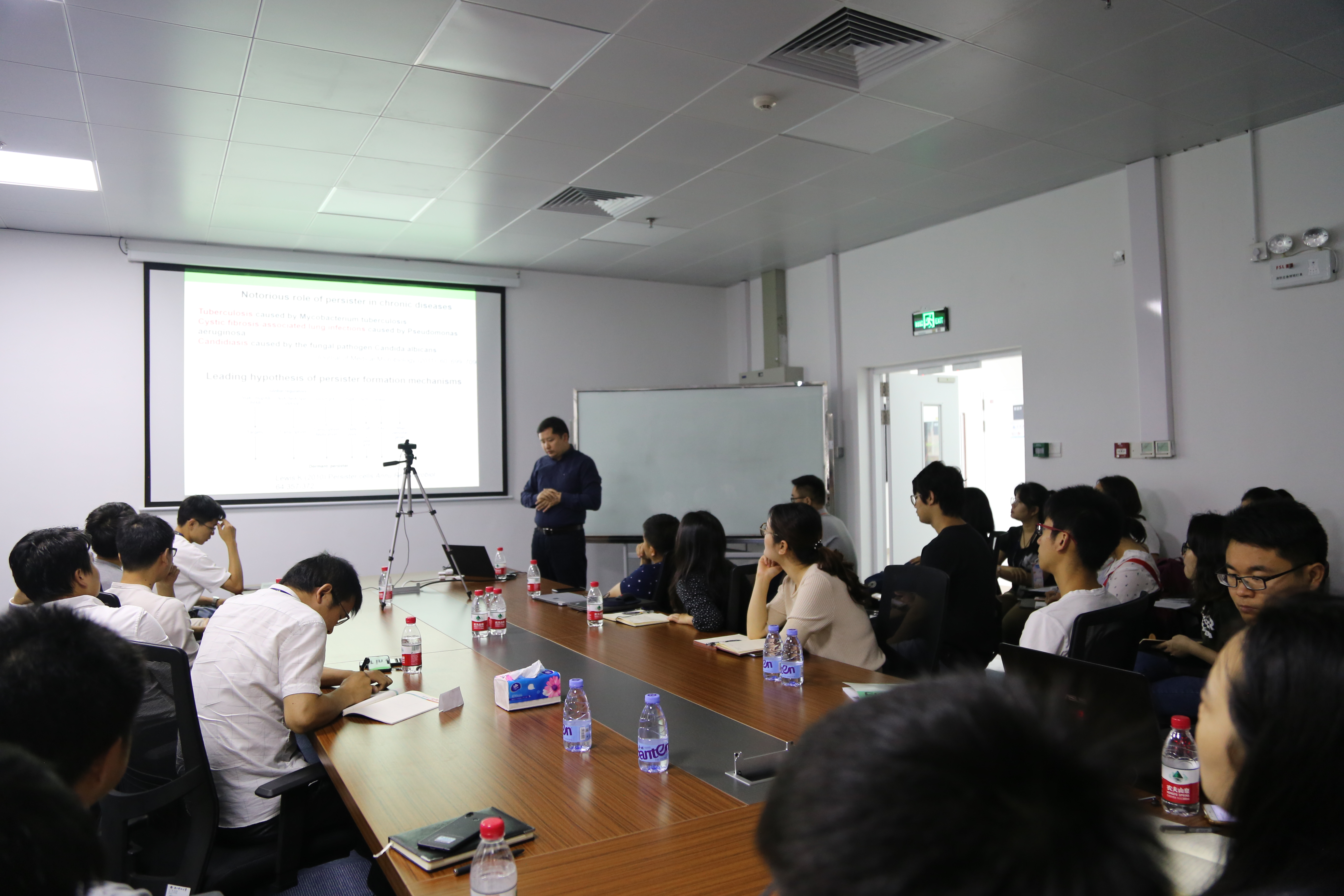 在細菌耐藥研究領域,報告圍繞著持留菌的形成原因和持留菌對抗生素的耐藥分子機制研究展開。白凡研究員首先介紹了細菌耐藥的機制,并介紹了細菌產生耐藥性是源自被稱為“持留菌”的基因異質性細菌亞群。通過耐藥細菌在撤除抗生素后復蘇過程中單細胞觀測等展開一系列的研究,并發現了每個持留菌表現出不同的休眠深度。其次,通過微流控技術對單細胞進行實時動態觀察,意外發現了伴隨著細菌休眠深度的加深,細菌細胞內會出現明顯的“小黑點”。通過蛋白熒光標記和高通量質譜鑒定,這些小黑點被證明是大量蛋白產生的聚合體,這些蛋白沉淀也是細菌進入深度休眠的原因。通過大量的單細胞實時熒光成像和分子生物學實驗,揭示了蛋白質沉淀聚合體的產生是由于細胞內ATP的耗竭。通過以上的研究工作系統闡明了耐藥細菌進入不同休眠深度的表型差異和分子機制,首次揭示了決定細菌復蘇生長所需要的時間快慢的關鍵生物過程,為消除細菌耐藥提供了新的思路和藥物靶標。