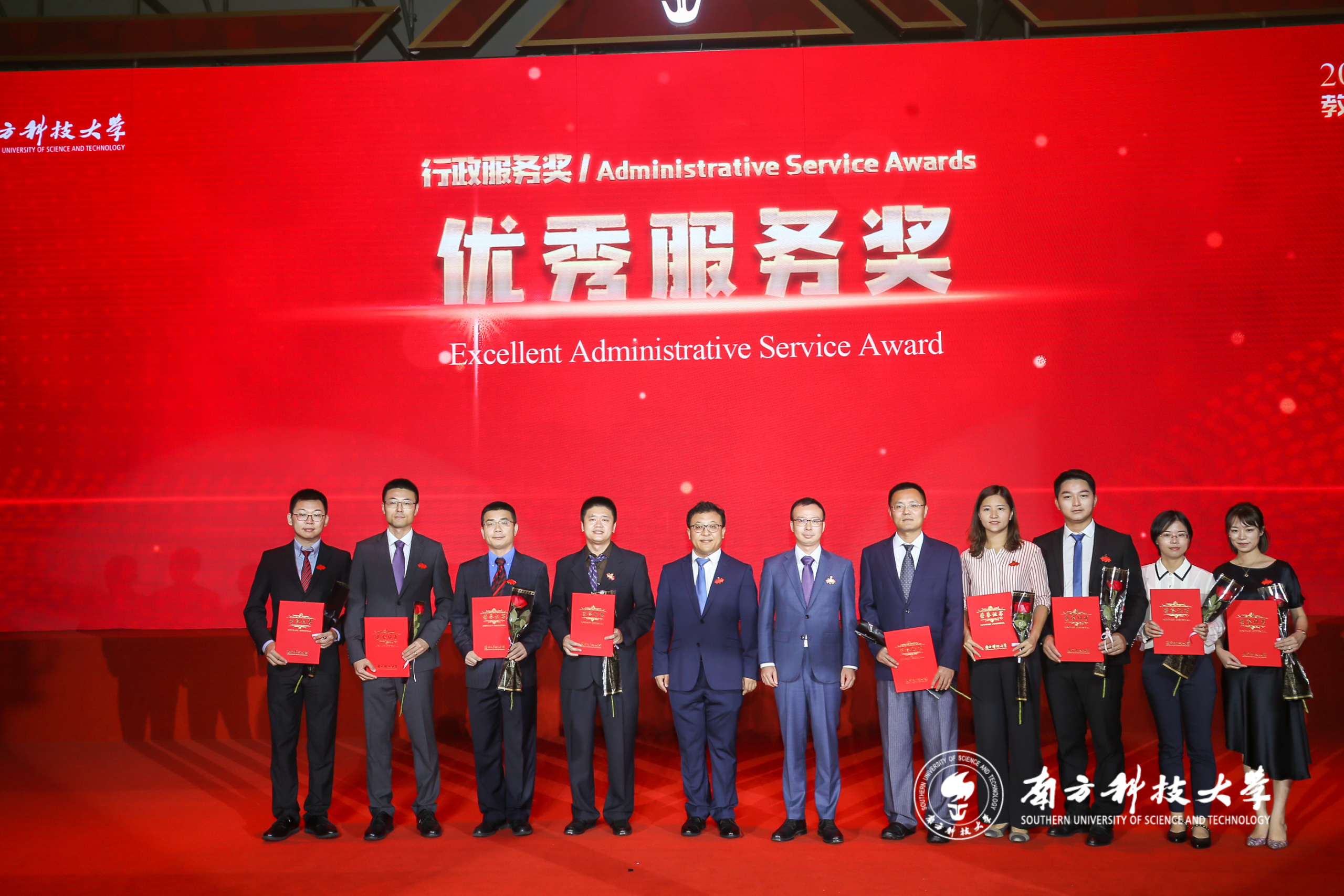 ? ? ? 2019年9月9日下午,南方科技大學2019年教師節表彰大會在學校潤楊體育館舉行,表彰榮獲2019年“教學獎”、“科研獎”、“優秀書院導師獎”、“年度教授獎”、“行政服務獎”、“五年服務獎”的獲獎教師。我校黨委書記郭雨蓉、校長陳十一等校領導,在校院士,各院系、部門負責人,教職工代表與學生代表出席大會。潤楊集團董事長楊軍、財務總裁劉飛鳴等應邀出席。大會由副校長、總務長魯春主持。