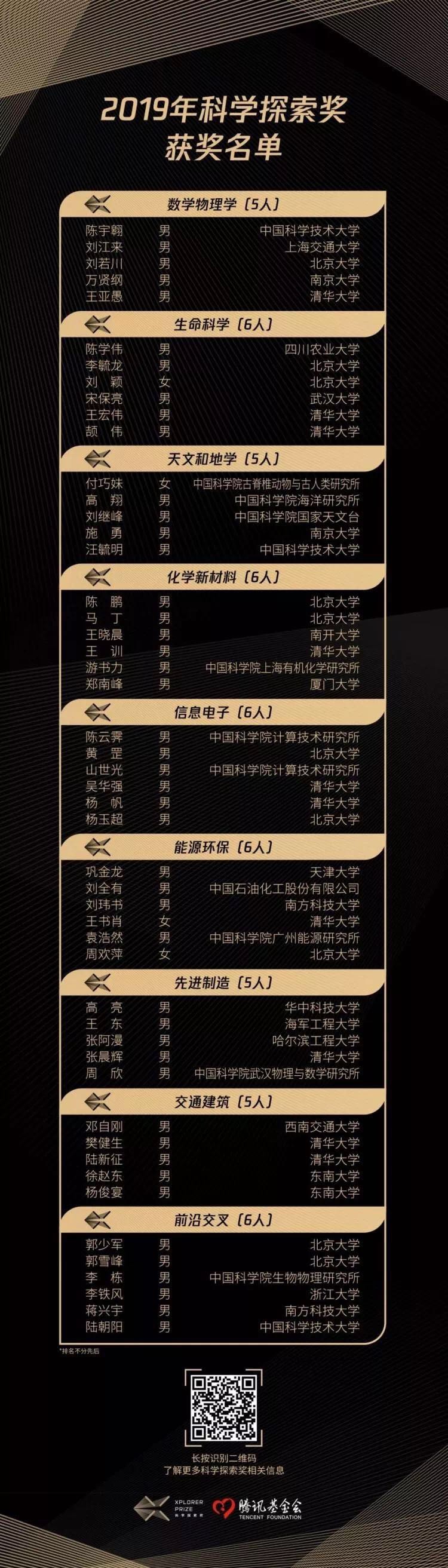 按學科領域分,數學物理學獲獎者5人、生命科學6人、天文和地學5人、化學新材料6人、信息電子6人、能源環保6人、先進制造5人、交通建筑5人、前沿交叉6人。