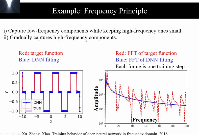 ? ? ? ?結合實驗與理論解釋,得出DNN具有擅長捕捉低頻分量,同時將高頻分量控制在較小的范圍內,并且逐步捕捉高頻成分的特點——頻率原則(Frequency Principle)。同時,關于“頻率還是幅度決定收斂速度”這一問題,許博士的研究發現:收斂是從低頻到高頻的。