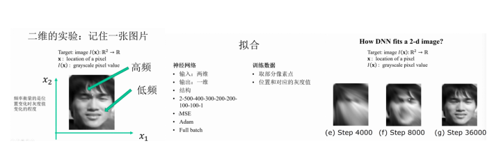 ? ? ? ?本次講座涉及到的模型中的“頻率”(Frequency)理解為“輸入變化一點點,輸出變化的大小”。在了解了DNN模型中所使用的“頻率”這一映射(mapping)基礎上產生的核心概念之后,從簡單函數/一維空間問題出發,頻率空間出現了頻率原則。首先,直觀地,通過實驗可以發現,DNN在擬合過程是從輪廓開始的,再隨著步數和層數增加,慢慢“抓住”細節。