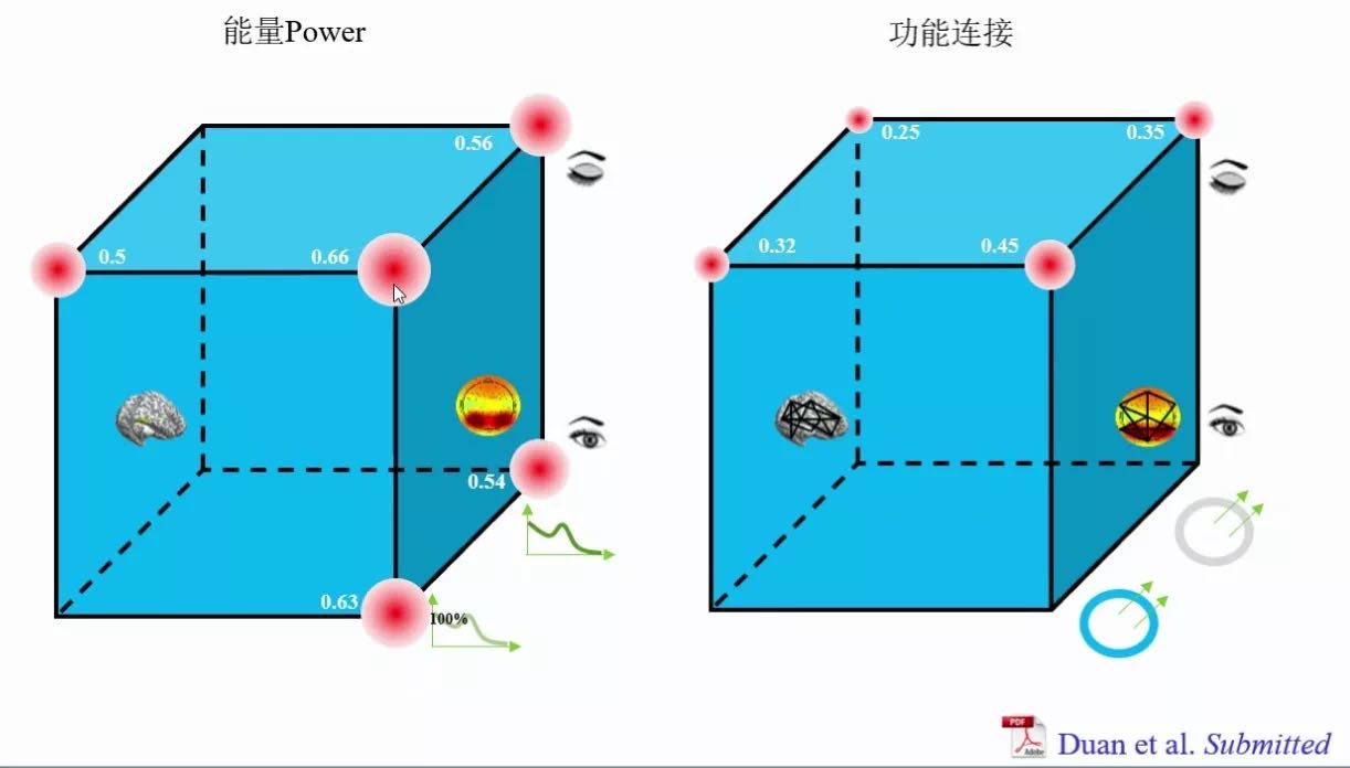 ? ? ? ?雷教授首先介紹了靜息態的定義,以及EEG和fMRI這兩種記錄靜息態神經活動的技術的時空分辨率互補性。緊接著,基于靜息態研究中的被試應睜眼還是閉眼的討論,雷教授進一步討論了EEG和fMRI在靜息態神經信號上的重測性差異。較早的基于fMRI的研究認為睜眼狀態下的被試其功能連接網絡能被更好地測量。而雷教授團隊發現,在多次靜息態測量中,被試的EEG信號特征,即頻譜能量特征和功能連接指標,在閉眼狀態下有更好的重測性(圖1)。另外,相比于將其投射到大腦皮層水平上,EEG信號的特征在電極水平的重測性更高(圖2)。
