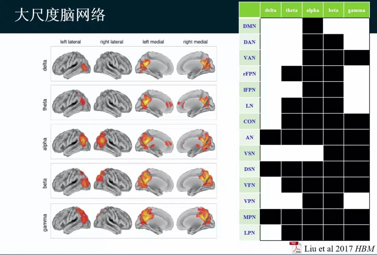 ? ? ? ?在空間方面,雷老師介紹了大尺度腦網絡方面的重要工作(Smith et al 2009 PNAS),該工作通過元分析的方法驗證了靜息態的腦網絡與來自之前研究的各種任務綜合得到的一些腦網絡具有高度的一致性,表明大腦在靜息態狀態下很有可能是在重現或預演其他任務。在另一項研究里(Mantini et al 2007 PNAS),研究者通過同步采集的EEG-fMRI研究了腦網絡與大腦節律的關系,發現腦網絡和特定節律的對應關系并不明顯,往往同時與多個節律具有相關性。接下來雷老師介紹了NCClab劉泉影老師在2017年的工作,該研究使用了高密度腦電采集信號,相比EEG-fMRI同步采集具有更高的信噪比。這項研究非常清晰的展示了不同腦網絡與特定節律之間的關系,通過上圖可以看到,對于大部分腦網絡與節律都只有較為寬泛的對應關系。在MEG的研究(Pasquale 2012 Neuron)中也發現的類似的現象。