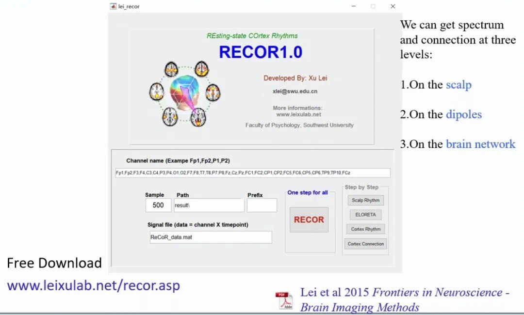 ? ? ? ?雷老師團隊提出了將來自fMRI的功能網絡作為空間先驗信息引入到EEG源成像中的網絡源成像(NESOI)方法。并且進一步將8種fMRI先驗得到的大尺度腦網絡作為靜息態腦電的空間先驗,開發了靜息態皮層節律成像軟件(正在開發2.0),該軟件可以完成頭表的節律分析,皮層的節律分析以及大尺度腦網絡的分析。無論是頭表的節律分析還是皮層的節律分析都可以一鍵完成,腦電預處理的功能也即將加入。還可以在腦網絡層面分析具體每個節律的能量,以及不同網絡之間的節律的功能連接。