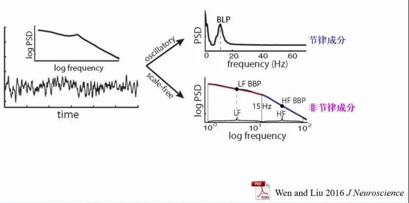 ? ? ? ?雷教授接下來介紹了神經信號在頻域上的“無標度性“特征與功能的關系。“無標度性“即信號功率正相關與頻率的倒數的特點(圖7)。而該正相關的系數可以反映不同個體、功能或腦區的特征。例如,無標度性特征可以預測區分內向與外向的人格特質。另一方面,在對比EEG和fMRI各自的無標度性時,其相關性在睡眠狀態下的更高(圖8)。基于這些發現,雷教授提出了EEG的節律成分與大尺度網絡相關,而非節律成分反映全腦的整體特性的假設(圖9)。