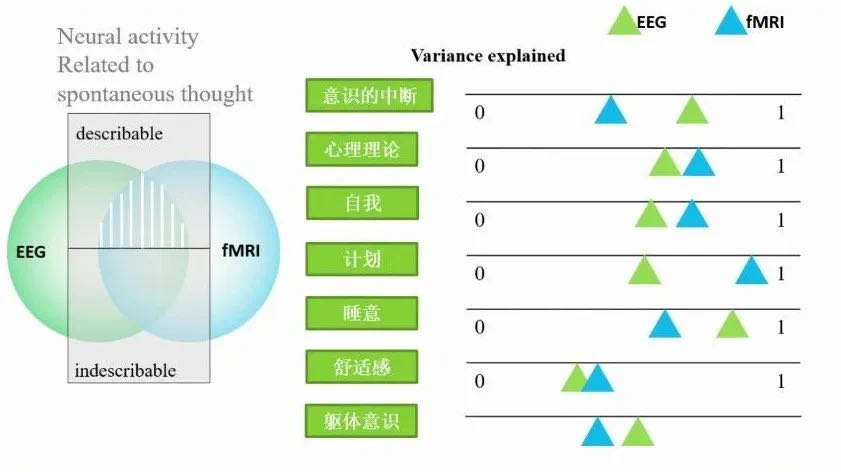 ? ? ? ?雷教授接下來講解了如何通過結合EEG和fMRI找到靜息態自發思維的神經指標。自發思維指例如意識中斷、回憶過去和想象未來等在靜息態下發生的思維過程。在10秒到1分鐘的時間尺度上,fMRI可以用于發現思維過程與大尺度鬧網絡激活的關系;而EEG信號可以被切割為長度為100毫秒從而將其電極水平特征對應到不同的“微狀態”(圖10)。雷教授團隊收集了70余個被試的EEG數據,1100余個被試的fMRI數據,并發現EEG和fMRI對不同的自發思維過程有不同的敏感度(圖11)。例如EEG對睡眠過程敏感度更高,而fMRI可能對特定腦區相關的功能的敏感性更高。