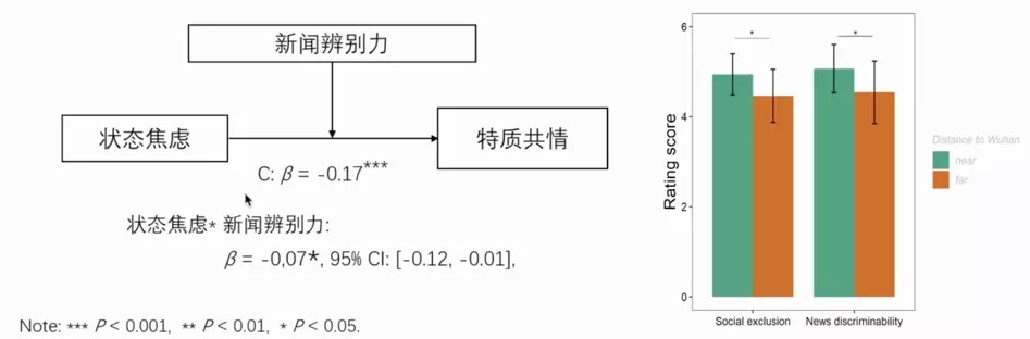 ? ? ? ?狀態焦慮與特質共情的關系可能是受到武漢距離調控的。即在強焦慮狀態下的被試中,距離武漢越近的被試的特質共情越低。