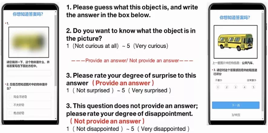 ? ? ? ?在第一個階段,被試需要猜測模糊背景下的圖片內容,并在對話框中填寫。在第二階段,提問被試是否想要知道圖片內容(1表示無好奇~5表示非常好奇)。第三階段有兩種條件,分別為提供答案和不提供答案。在提供答案的條件下,讓被試評價對圖片的驚訝程度(1不驚訝~5非常驚訝)。在不提供答案的條件下,提示被試此問題不提供答案,請評價你的失望程度(1不失望~5非常失望)