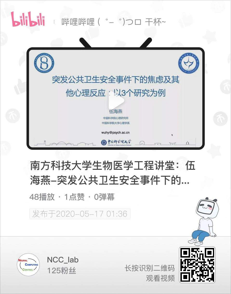 ? ? ? ?受南方科技大學生物醫學工程系邀請,來自中國科學院心理研究所的伍海燕副研究員于騰訊會議平臺以專業又不失幽默的方式通過最近的研究案例闡釋了突發公共衛生安全事件(如,新冠肺炎)下產生的焦慮等心理反應。此類問題相關的研究角度多樣,例如心理理論、社會影響、文化影響,情緒因素等,也包括決策的計算模型等定量研究。研究方法則主要涉及在線實驗,腦刺激,腦影像處理和EEG-fMRI同步技術等。