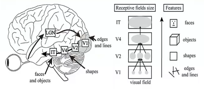 ? ? ? ?從視覺皮層的編碼特征上來看,視覺信號從V1-V2-V4-PIT-IT 信息的逐層處理過程中,對應的神經元的感受野越來越大;每層之間感受野增大的系數大體為2.5;高級別的神經元將信息集成在具有較小感受野的多個低級神經元上,編碼更復雜的特征。分別來說,V1區是編碼的邊緣和線條等基本特征;V2區神經元對錯覺輪廓有反應,是色調敏感區;V3區是信息過渡區;V4是色彩感知的主要區域,參與曲率計算、運動方向選擇和背景分離;IT區是物體表達和識別區(圖1、圖2)。從近些年來深度學習和機器視覺的發展可以看出,深度卷積網絡也與視覺皮層的編碼特征呈現出了類似的形態(圖3)。