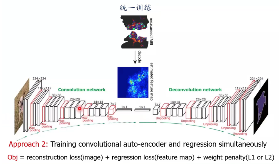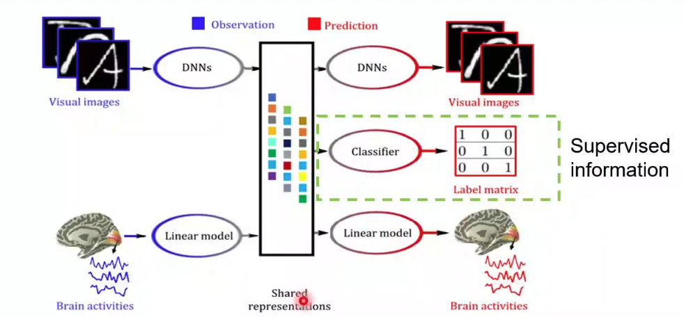 ? ? ? ?接下來何老師分享了其他的一些思路。同樣是對之前模型的擴展,將多視圖生成式自編碼模型中添加了語義這一輸出,就可以得到語義信息的解碼(圖12)。由于圖像刺激的類別或者向量包含了圖像刺激中的高層次語義信息,該模型可以把大腦響應解碼到高層次的語義空間。