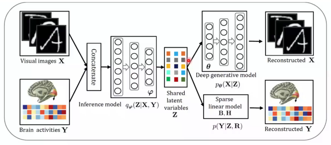 ? ? ? ?然后何老師介紹了多視圖生成式自編碼模型(Deep generative multi-view model(DGMM)),該研究由何老師課題組博士生杜長德(已畢業)完成。該模型基于這樣一個假設,即視覺圖像和大腦響應是同一客體在不同特征空間中的外在表征。由該假設可得視覺圖像和大腦響應可以由同一隱含變量通過不同的生成模型得到。這樣一來,視覺圖形重建問題就轉變為了多視圖隱含變量模型中缺失視圖的貝葉斯推斷問題。