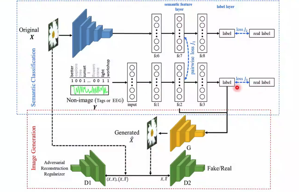 ? ? ? ?在多視圖生成式自編碼模型基礎上,何老師課題組博士生李丹搭建了新的網絡,以用于基于多模態融合的對抗神經信息解碼。從圖10中,我們可以了解該網絡的框架。最上層輸入圖片到標簽的過程是一個AlexNet,該網絡可以學習圖片的分類標簽,并在fc7層輸出一組語義特征。對于文本或EEG信號這樣的非圖像信息,作者也訓練一個網絡來提取語義特征fc2和分類。當這兩個網絡的數據是成對數據的時候,在兩組語義特征間計算一個損失,使兩組特征相互聯系。對于非圖像的網絡,作者提取了語義特征和分類標簽輸入一個生成器生成圖像。生成圖片之后,將圖片輸入一個判別網絡判斷圖片是真實圖片還是生成圖片。如果是成對數據生成的圖片,還要將生成圖片和原始圖片一起輸入另一個判別網絡,以判斷兩張圖片是否對應。