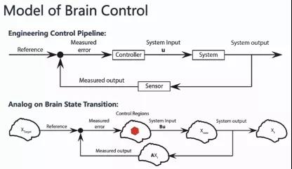 ? ? ? ?從控制的角度出發,講述如何對大腦網絡進行控制。第一個圖是經典的工程控制過程。為了維持系統的正常運行,從當前的狀態校正到期望的狀態。在每個時刻,通過測量系統狀態信息與期望狀態的誤差,通過設計系統控制器,以降低誤差的形式進行系統調控。第二個圖是將類似的思想用于腦網絡控制,例如對于大腦的狀態轉換的控制。比如任務狀態切換、區域激活抑制或者區域信號加強等。大腦內部區域抑制某些區域的信號,通過把某些區域當做控制區域,信號從這些區域輸入,從而影響整個大腦的激活狀態;或者說連接情況的改變,使得大腦從當前狀態轉移到目標狀態,從而實現認知控制的過程。