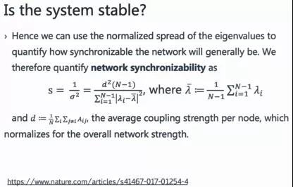 ? ? ? ?系統的穩定性通過系統的同步性S進行度量,直觀上理解這個度量指標就是特征值方差的倒數。公式中,d表示連接的平均強度,主要是用于正則化,消除掉邊的連接強度因素。如果說特征值都靠的非常近,意味著大腦很容易就處于同一個模式(mode)。如果大腦都處于同一個模式,那么它整個狀態的豐富性、靈活性都會受到比較大的影響,整體的效率(efficiency)也會下降。
