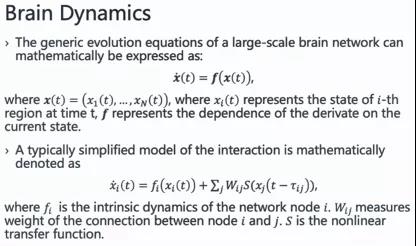 ? ? ? ?下面是一個簡化的模型,它考慮了不同區域之間的相互作用,比如第i個區域它的導數依賴于自身的狀態變化f_i。相互作用即不同區域對i區域的一個影響。tau_{ij}表示時間的延遲,W_{ij}表示兩個節點間的權值,S表示非線性轉移函數。對于具體功能的腦網絡,我們需要推斷系統的變換參數。對于結構腦網絡,可以假設這個f_i可能的形式,W_{ij}則可能以某種形式依賴于它的連接狀況。