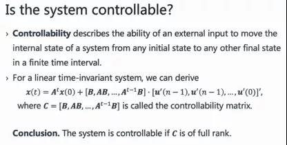 ? ? ? ?可控性(controllability)就是系統在給定外部輸入,移動到目標狀態的能力。如果每個狀態都是可達的(reachable),這個系統就是可控的。從純理論上來說就是:系統能否在t步時間內達到目標狀態。從最開始的線性方程,通過推導得到前面t-1時刻可能性的輸入,也就是這里所寫的C矩陣的公式。如果這里所記的C矩陣是一個滿秩矩陣,不管前面的x_t, x_0怎么變,總能選取一定的u值,使得方程成立。