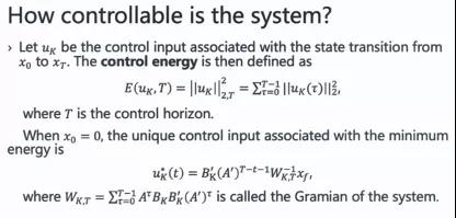 ? ? ? ?當我們要改變這個系統,系統的可控性涉及到需要多少能量。需要能量很少,意味著這個系統很容易改變,也即這個系統更容易被控制。這里描述的是一個T步的離散的過程。連續過程可以轉換成積分形式。這里控制能量定義為每個時刻的u的2次方做累加,這是一種最直觀的方式。當然也可以采集不同形式進行定義,比如添加正則化等。定義好控制能量之后,可以通過極小化控制能量,來求解出每個時刻的u_K。