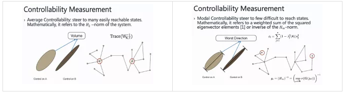 ? ? ? ?平均可控性主要是衡量單位能量下系統能達到不同狀態的平均情況。也就是說,把一份能量放在哪些區域,平均來說它更容易影響到整個系統的變化。大家可以理解成,給定單位能量,能到達的狀態的一個面積。在這種情況下,如果把這份能量放到連接邊數比較多的區域,那么它就更容易影響其他相連接的區域。從平均的意義上,這些區域就是一個更有效的選擇。