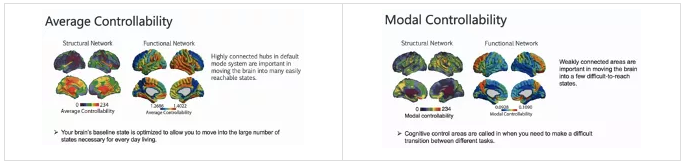 ? ? ? ?這里展示了兩種可控性的大腦地圖(map)分布,即基于前面我們定義的度量,這兩種可控性度量在大腦的具體哪些區域的數值比較高(紅色),哪些腦區比較低(深藍色)。左邊展示了基于結構腦網絡,右邊展示了功能腦網絡的具體情況。