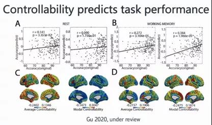 ? ? ? ?在具體的working memory task,我們可以發現平均可控性和模式可控性可以預測具體任務的分數。尤其在frontal和parietal腦區承擔重要角色,從某個角度印證了這兩個控制度量從某種程度確實是可以刻畫大腦在認知任務的效率問題。