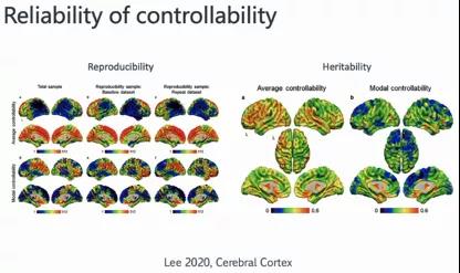 ? ? ? ?右圖反映了遺傳性關系,觀測遺傳基因的表達,或者測量不同子代之間的親代和子代之間的關聯性。可以發現prefrontal的區域,在平均可控性上它的遺傳性相對來說更高。而在模式可控性,遺傳性更多的是在Pre-temporal和Supramarginal的區域,它可能是衡量可遺傳的具體特征。