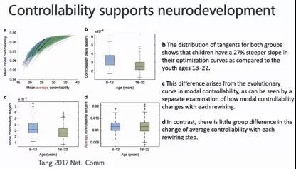 ? ? ? ?這個研究證明了可控性與神經發育的關系。結合圖a和圖b來看,在不同年齡段,發展的一個趨勢是由變化,即tangent斜率決定的,在8到12歲和18到22歲,它們的tradeoff關系不是線性的。圖c和圖d為不同年齡段的平均可控性與模式可控性的tagent。平均可控性相對來說是一個線性變化。而模式可控性表示執行復雜任務,它的變化是一個非線性的過程。從8到12歲和18到22歲的發育過程,對于復雜任務的處理或者相對復雜任務的發育,呈現出非勻速的過程。平均可控性的tangent在兩組之間相對沒有差異,也就是說青春期之后的大腦的過程,可能涉及到兩個度量之間的tradeoff,對復雜任務和平均任務來說,更多的是平均發育過程。