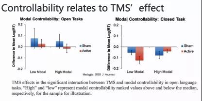? ? ? ?這是在TMS’ effect上的研究。在低模式可控性(Low Modal Controllability)以及高模式可控性(high modal controllability)的大腦區域上分別進行TMS的干涉。
