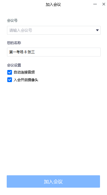 (五)面試前25分鐘,候考引導員A告知考生單獨正式考場會議碼提醒考生進入單獨正式考場。考生可以離開候考室。考生需以“第幾考場+考生序號+姓名+考核機位”、“第幾考場+考生序號+姓名+監控機位”兩個號碼接入單獨正式考場。