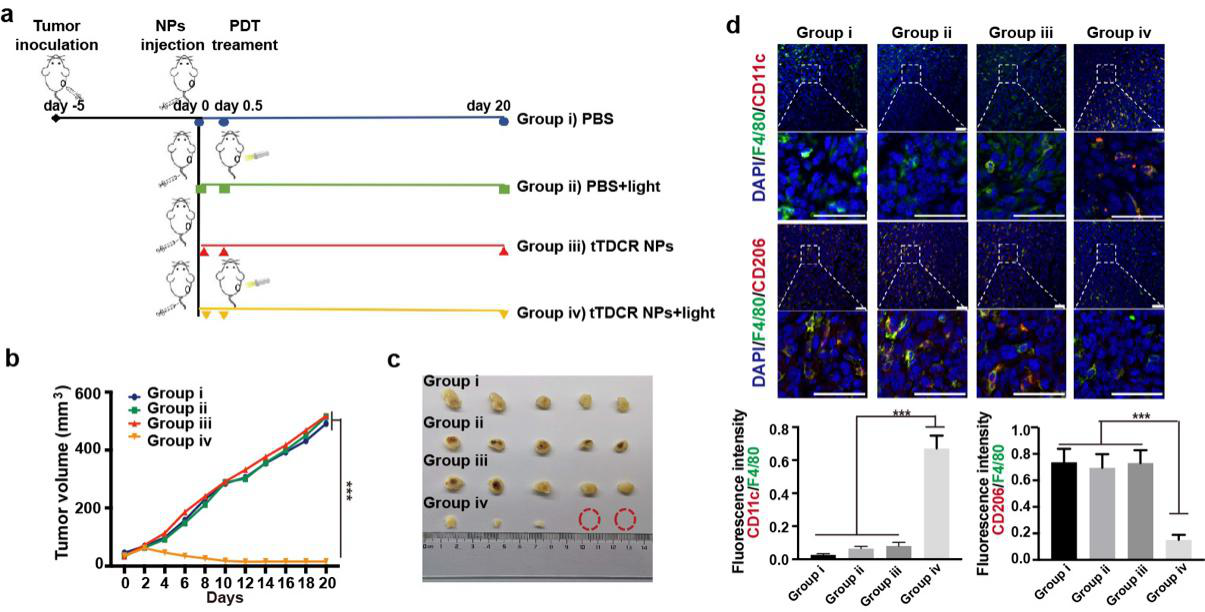 ? ? ? ?體內實驗進一步證實,該I型光敏劑tTDCR NPs能夠通過誘導腫瘤組織內的M2型巨噬細胞極化為M1型,從而實現幾乎完全抑制小鼠4T1皮下瘤生長。而在清除腫瘤組織內的巨噬細胞后,tTDCR NPs抑制腫瘤生長的作用被逆轉。