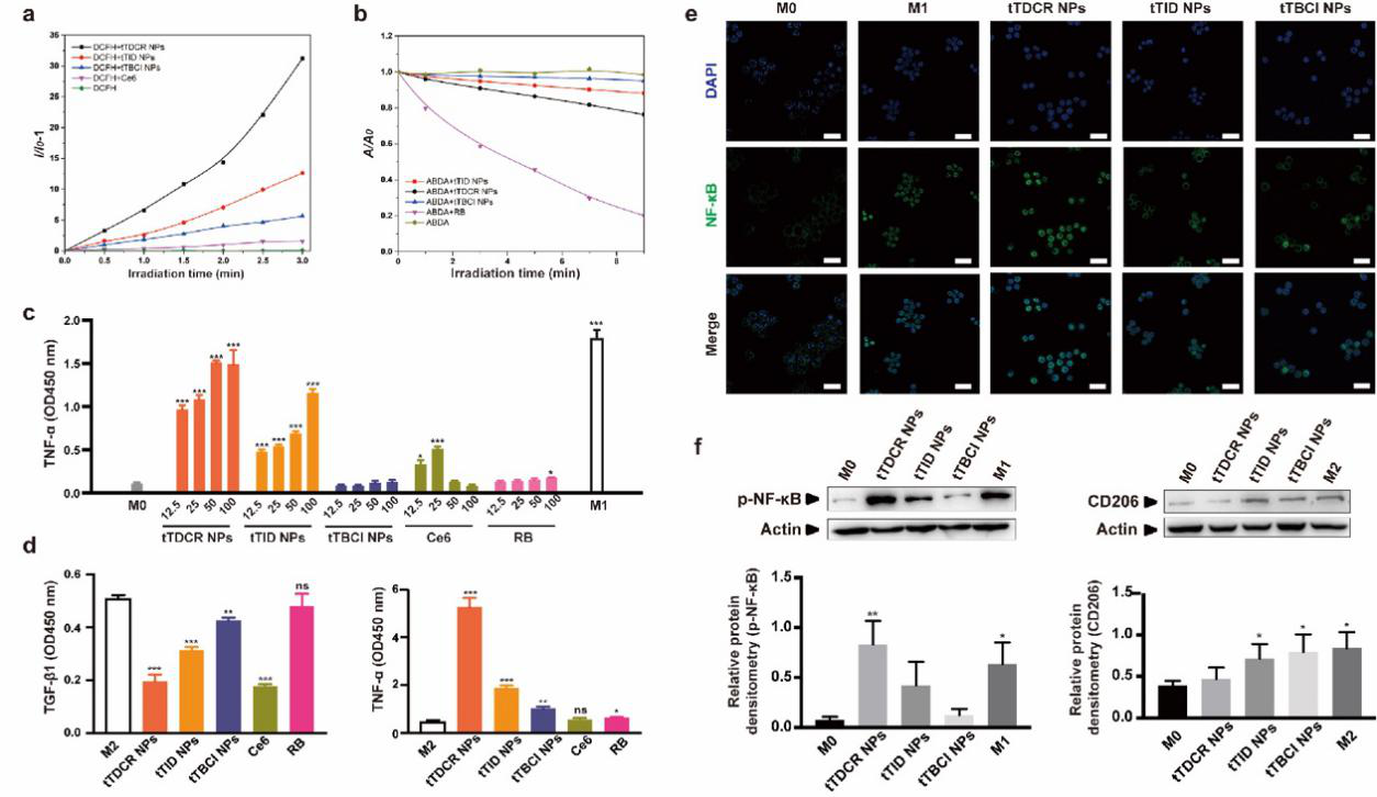 ? ? ? ?研究人員首先通過分子調控合成三種具有不同ROS產生效率的D-A構型的光敏劑tTBCI,tTID和tTDCR,其ROS產生效率依次升高,并具有聚集增強ROS產生的能力。實驗發現,I型機制產生的胞外ROS能夠將M0和M2型巨噬細胞誘導成M1型,并且具有最高ROS產生效率的分子tTDCR NPs效果最好,且這一作用是通過激活巨噬細胞內NF-κB信號通路實現的。而在相同實驗條件下,II型商業化光敏劑孟加拉紅(RB)產生的胞外ROS未顯示出誘導巨噬細胞向M1型極化的作用。