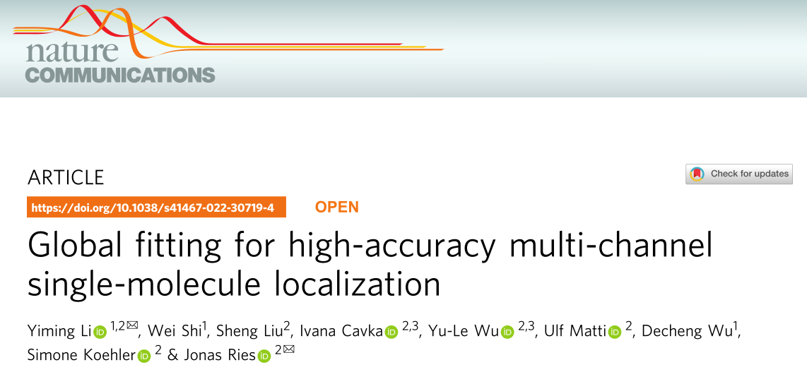 ? ? ? ?2022年6月7日,南方科技大學李依明副教授、歐洲分子生物學實驗室Jonas Ries研究員課題組合作在Nature Communications上發表了題為“Global fitting for high-accuracy multi-channel single-molecule localization”的研究。提出一種基于GPU加速的多通道全局擬合算法globLoc,用于三維單分子定位,它可以從多通道單分子數據中提取最大信息,提高了雙平面和4Pi-SMLM的定位精度,并改善了比率多色三維SMLM的顏色分類。