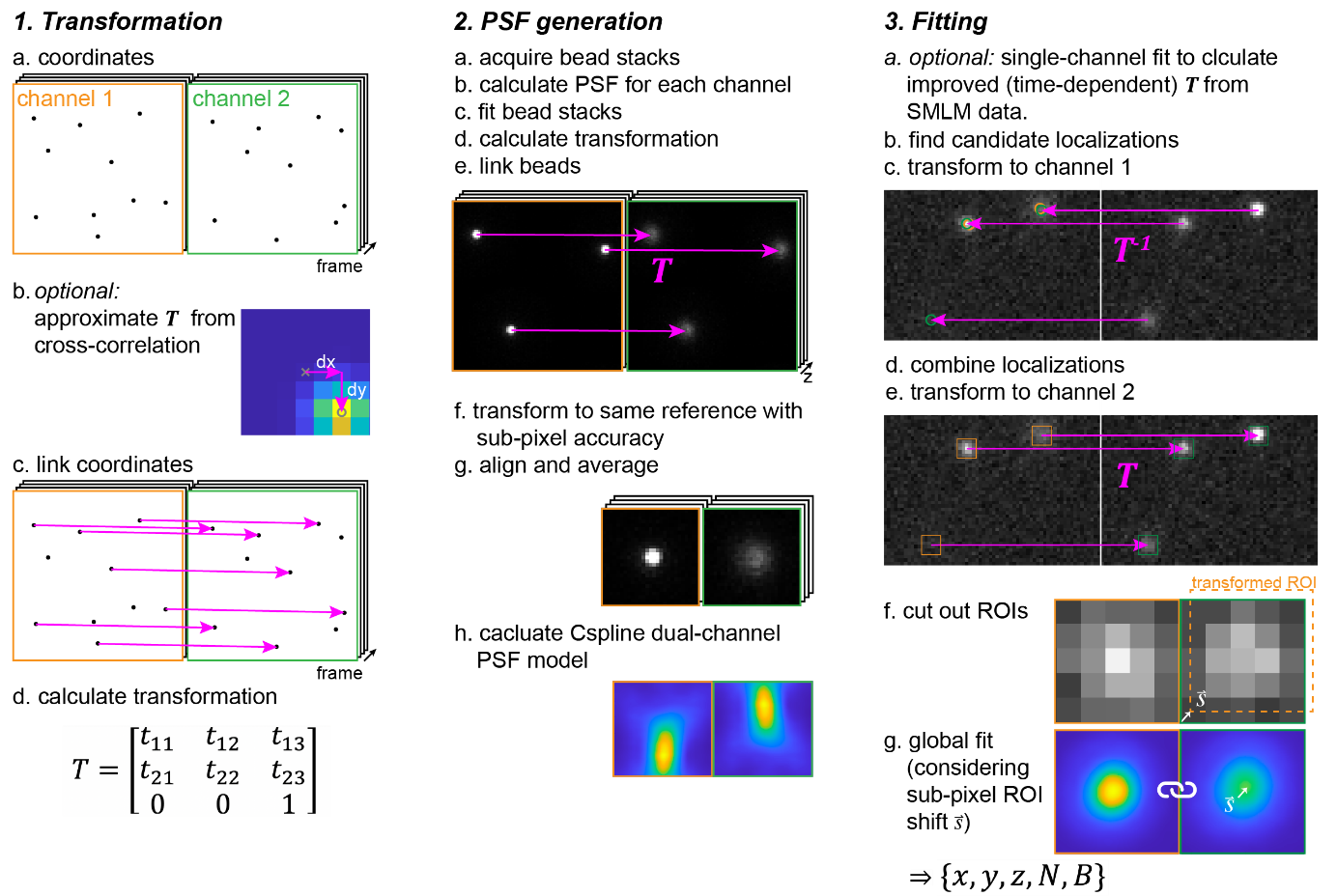 ? ? ? ?與單通道SMLM相比,多通道的數據分析相對比較復雜,因為必須把兩個或多個通道結合起來才能得到額外的信息(顏色、z位置、偏振狀態、干涉相位等)。傳統的方法是首先在每個通道中分別擬合熒光團以提取相應的參數,然后組合從不同通道返回的參數來獲得額外信息。單個熒光團在多個通道中的單獨擬合不是最佳的,因為忽略了高度相關的信息(例如三維位置和光子等)。相反,如果我們使用一個全局擬合器來鏈接不同通道中的相關參數,這將減少擬合參數的數量,提高擬合的精度和魯棒性,并避免不同通道中相應參數配對時引發的不確定性。因此,研究人員開發了多通道全局擬合方法globLoc,并設計了一個通用的數據分析工作流程,方便使用軟件對不同通道中檢測到的單分子數據進行全局擬合。其優化的分析流程包括: 生成通道之間的轉換映射關系,校準全局多通道PSF,基于GPU的全局擬合器實現快速和精確定位,以及后處理程序提取額外的信息(z位置,顏色,干涉相位,偏振等)。在仿真和實驗數據中,研究人員發現全局擬合能夠顯著提高雙平面和4Pi-SMLM的定位精度以及多色SMLM的顏色分類。