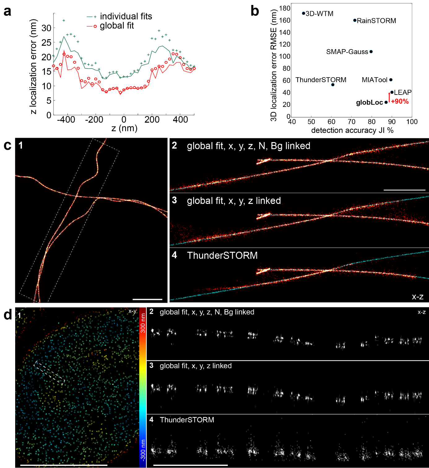 ? ? ? ?由于globLoc可以靈活地鏈接不同通道之間的參數,研究人員比較了在單獨擬合,全局擬合下對鏈接XYZ位置和鏈接XYZ以及發射光子情況下的定位精度。與擬合單獨通道然后對位置進行Cramer-Rao-Lower-Bound(CRLB)加權平均相比,globLoc提高了大約1.5倍的z定位精度(圖2a)和更加魯棒的參數估計。這一分辨率的提高通過參加持續舉辦的2016 SMLM Software Challenge得到了進一步證實,在該挑戰賽中,globLoc在雙平面數據上的3D定位精度比其他表現最好的算法LEAP提高了近兩倍(圖2b)。對訓練數據集(模擬微管),與主要的SMLM分析軟件ThunderSTORM (圖2c)相比,有了明顯的改善。對核孔復合體(nuclear pore complex,NPC)上標記的Nup96蛋白質實驗數據結果顯示,globLoc相比ThunderSTORM改善更為明顯,globLoc能夠清晰地解析NPC的雙層環狀結構(圖2d)。