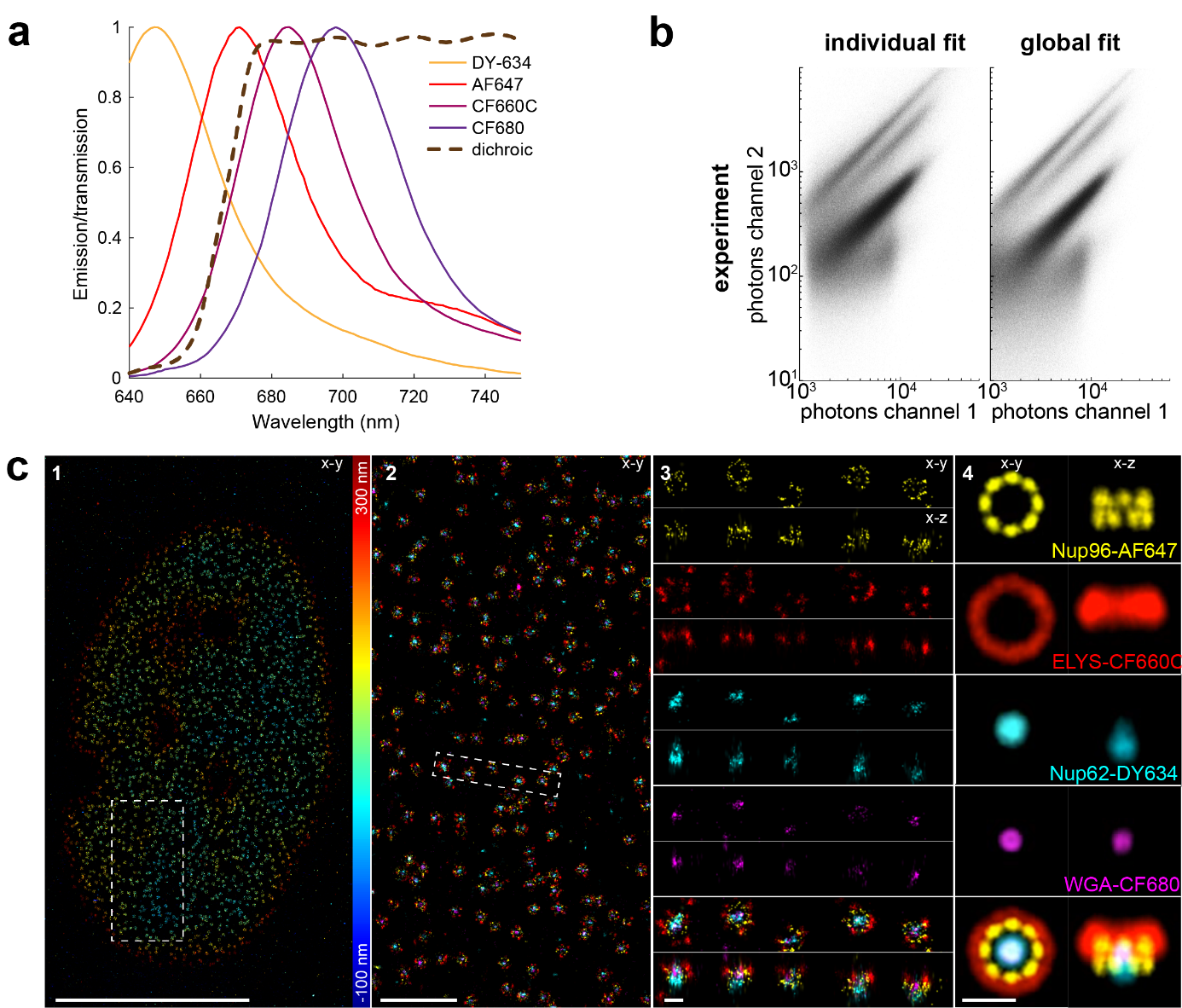 ? ? ? ?globLoc的全局擬合對具有重疊發射光譜的多種染料進行成像分析,根據在每個通道中檢測到相對光子數量區分單個分子的顏色(圖4a)。globLoc提高了定位光子數的準確性,從而在模擬和實驗中提高了顏色分類的準確性(圖4b)?,同時利用綜合利用了所有檢測到的光子進行定位,沒有造成光子數的損失。globLoc的這些創新使得在比率分色3D SMLM(圖4C)中首次對四種染料同時成像并準確地區分出四種顏色。實驗驗證中采用AF647、DY634、CF660C和CF680染料對單個NPC的Nup96、Nup62、Elys和WGA蛋白標記后的成像結果顯示,四種顏色沒有明顯的串擾。研究人員對200個NPC圖像進行了平均,得到了四種NPC蛋白質的平均后的結構位置,其中 Nup96 形成兩個具有八聚體對稱性的環,Elys形成一個大環,Nup62和WGA位于圓環的中央通道。值得注意的是,這些是熒光團的平均分布,由于抗體大小及其非隨機方向可能會引起的連接錯誤而導致的表位的分布不同。