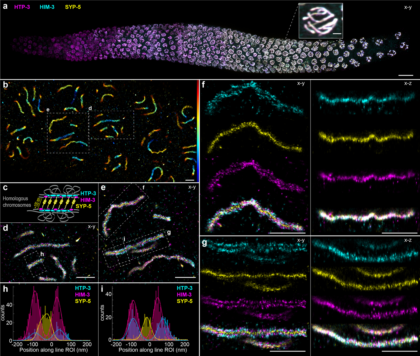? ? ? ?為了證明globLoc在具有挑戰性的樣本上的表現,研究人員對線蟲的聯會復合體進行了比率三色3D成像(圖5a)。單個的聯會復合體可以在三維空間內清楚地分辨出來(圖5b)。聯會復合體的三種不同成分HTP-3、HIM-3和SYP-5的N端被很好地分離出來,沒有明顯的顏色串擾,并且這三種組分的空間排列與之前的研究非常吻合。