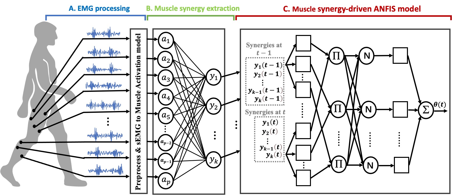 ? ? ? ?張明明課題組長期以來一直致力于面向生活任務的智能、精準、閉環、高效的神經康復技術及器械的開發和研究。近期該團隊提出一種基于肌電信號預測連續下肢膝關節角度的解碼方法,即基于肌肉協同驅動的自適應模糊神經網絡預測模型(Muscle synergy- driven ANFIS model),實現了在不同步行速度下的膝關節角度的穩定連續預測。相關論文以《A Muscle Synergy-Driven ANFIS Approach to Predict Continuous Knee Joint Movement》為題發表于國際頂級期刊IEEE Transactions on Fuzzy Systems(IF=12.029)。