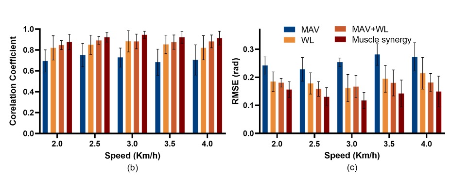 ? ? ? ?通過5種不同速度的步行實驗表明, 本論文提出的Muscle synergy-driven ANFIS model的預測準確度達到相關系數為0.92±0.05,相比于目前基于當通道數值特征方法,預測準確性和計算效率均有顯著性提升。同時,肌肉協同作為肌肉激活度與人體運動間的橋梁, 本方法有效地建立了兩者的非線性關系,提高了模型的可解釋性。