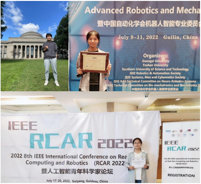 左上:文章發出時戴存璽正在MIT進行交流;右上:付沛文參加ICARM獲獎答辯;下:馬芮參加IEEE RCAR會議獲獎答辯