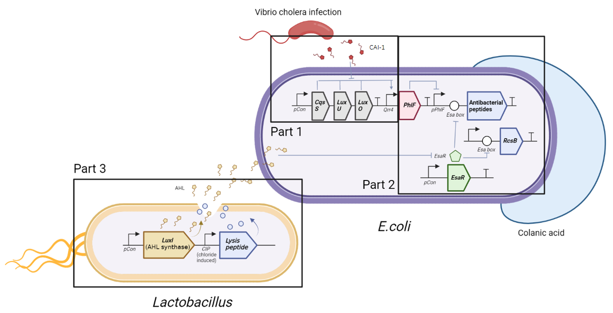 ? ? ? ?霍亂是一種由霍亂弧菌感染引起的急性腹瀉傳染病,嚴重時可使患者脫水致死。霍亂的病情離不開腸道菌群的失調,因此對腸道菌群進行調節可以作為治療霍亂的一種方法。SUSTech_Shenzhen_HCL團隊以乳酸桿菌和大腸桿菌為載體,利用基因工程技術,利用細菌之間的群體效應,開發了一套可以預防和治療的益生菌系統。