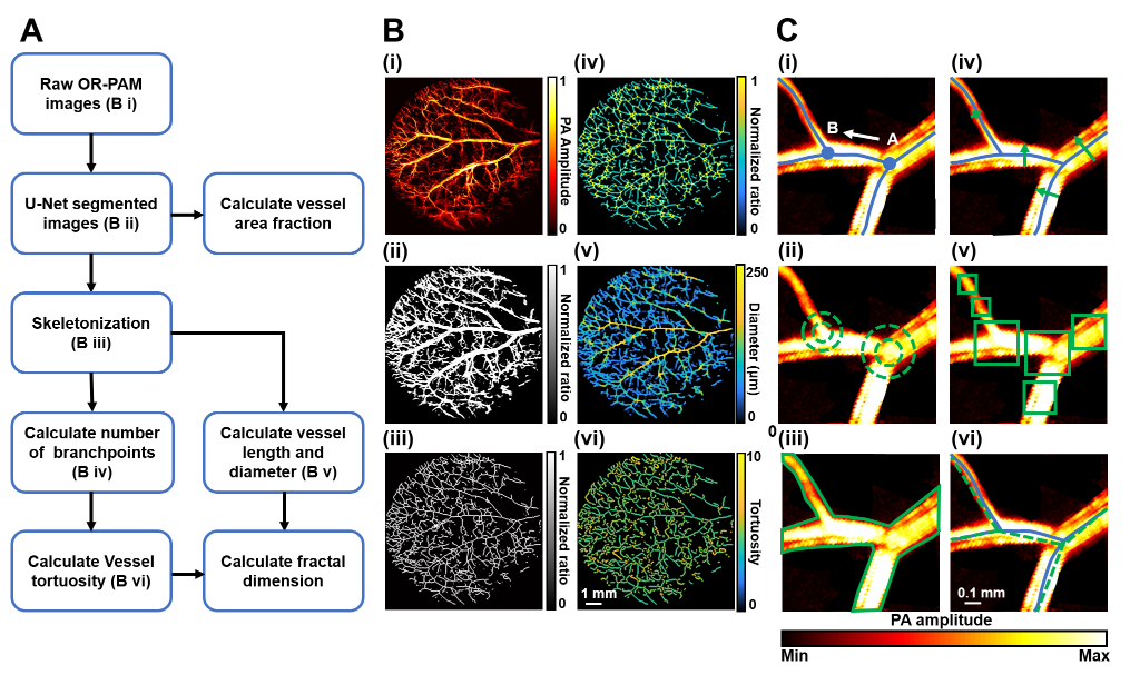 圖1展示了通過U-Net神經網絡及參數提取算法對PAM圖像的處理過程,定義了血管長度、直徑、分支點數、密度、彎曲度以及分型復雜度等參數,從而對血管進行形態學量化。通過建立基于不同感染階段PAM圖像的訓練集,U-Net提供了高準確度與特異性的血管分割方法,使得參數計算更為精準。