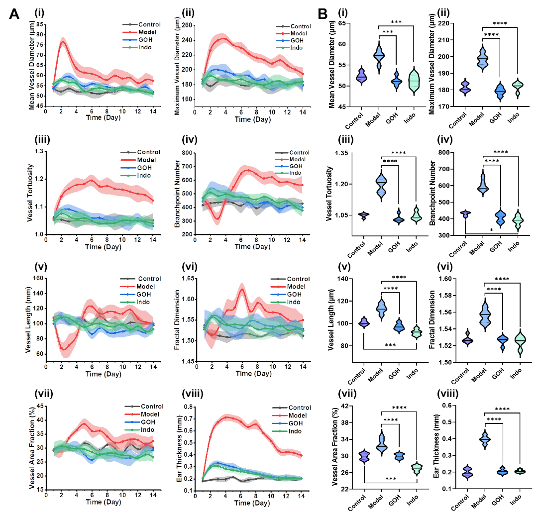 圖2和圖3展示了炎癥發展及藥物治療的過程以及血管參數的變化。通過對已有文獻提出的炎癥過程中細胞和分子層面變化的總結,將血管參數變化與其進行了分階段對應,綜合8個參數的變化對炎癥中止血、感染、增殖和重塑的階段進行了表征。結果表明了PAM定量分析方法有取代組織學切片檢測,并提供無創皮膚病理診斷的潛力。