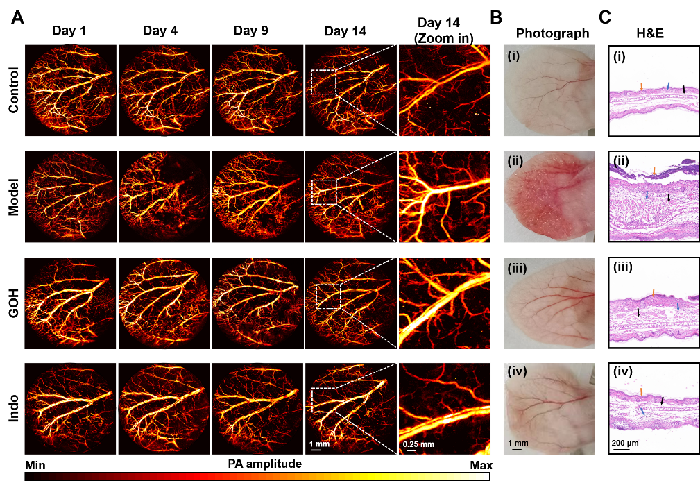 該研究提出了一種基于光學分辨率PAM對皮膚炎癥進行長期監測與定量化分析的方法,通過對炎癥小鼠模型及治療模型的長期連續成像監測,以得到不同感染和治療階段的光聲血管網絡圖像。基于深度學習算法對圖像進行處理和參數提取,對所提取參數的變化趨勢進行分析和對比,結合關于炎癥過程分子機理的研究,得出了血管形態和炎癥機理的內在聯系,證明了PAM可提供一種無創且針對血管形態的量化方式。該方法展現出了一定的臨床應用前景,有希望成為一種新型的針對皮膚炎癥發展以及治療過程的定量監測分析方法。