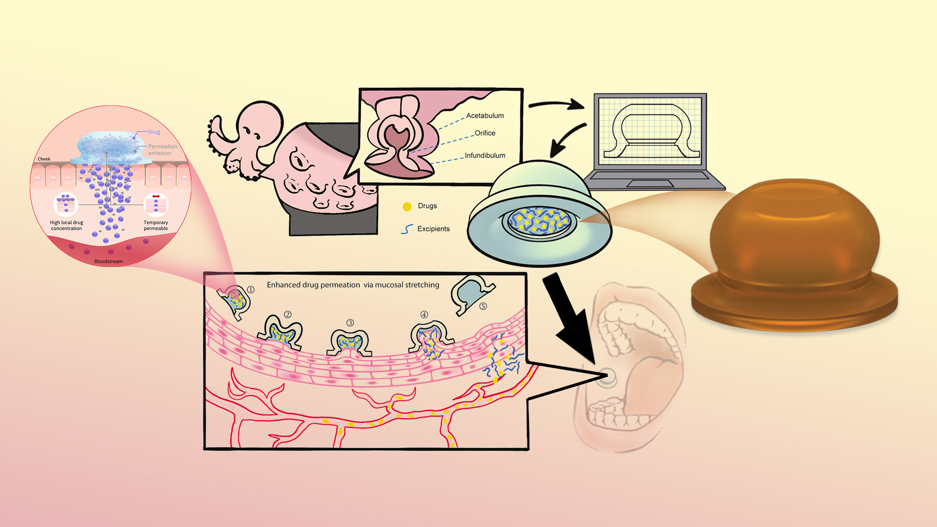 圖1. 一種仿生章魚吸盤通過口腔黏膜的機械變形來輸送大分子藥物的生物吸力貼片