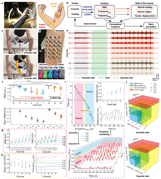 如圖2所示,由于TPP的高拉伸性和粘附性,電極即使在皮膚褶皺中也能保持穩定的接觸,從而提供較低的界面阻抗。作為干電極,它可以具有更長的工作時間,是Ag/AgCl電極的16倍。基于MPC電路,作者還制作了一種多通道sEMG金屬聚合物電極陣列貼片,以實現高質量、高密度的sEMG信號,用于監測肌肉負荷和肌肉疲勞,其性能比商用sEMG陣列更穩定。更重要的是,MEAP可持續監測肌腱位移,將肌腱拉伸控制在安全范圍內,從而降低肌肉或肌腱損傷的風險。