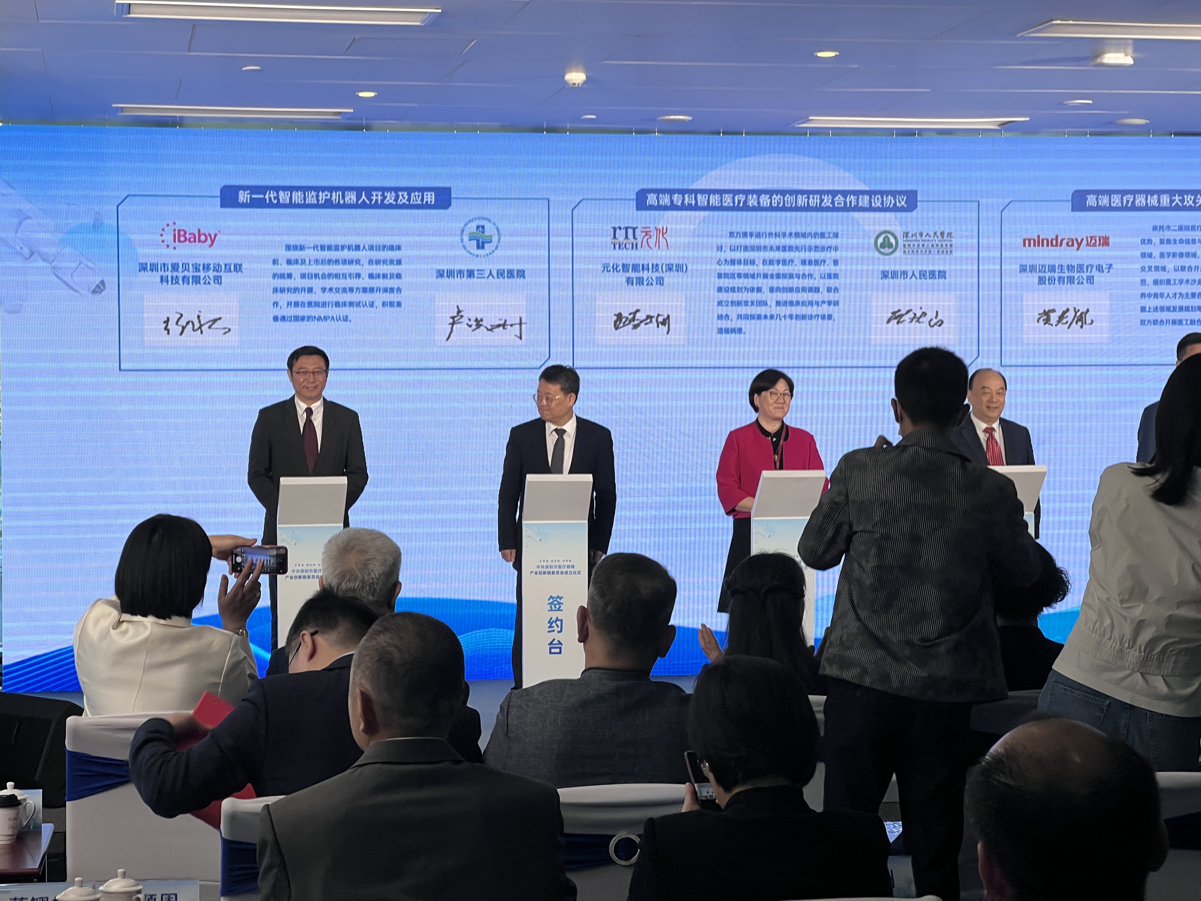 ? ? ? ?2023年12月8日,“匯智造·鏈未來·創高地——深圳市醫療器械產業創新鏈黨委”成立儀式在南山智園舉辦,深圳市委常委、組織部部長程步一等市領導親臨現場,見證三家深圳醫院(深圳人民醫院、深圳第二人民醫院、深圳第三人民醫院)和三家深圳企業的聯合研發簽約儀式。其中,南科大生醫工系于2023年獲批的孔雀團隊產學研項目“新一代智能監護機器人”完成了和深圳市第三人民醫院的簽約。