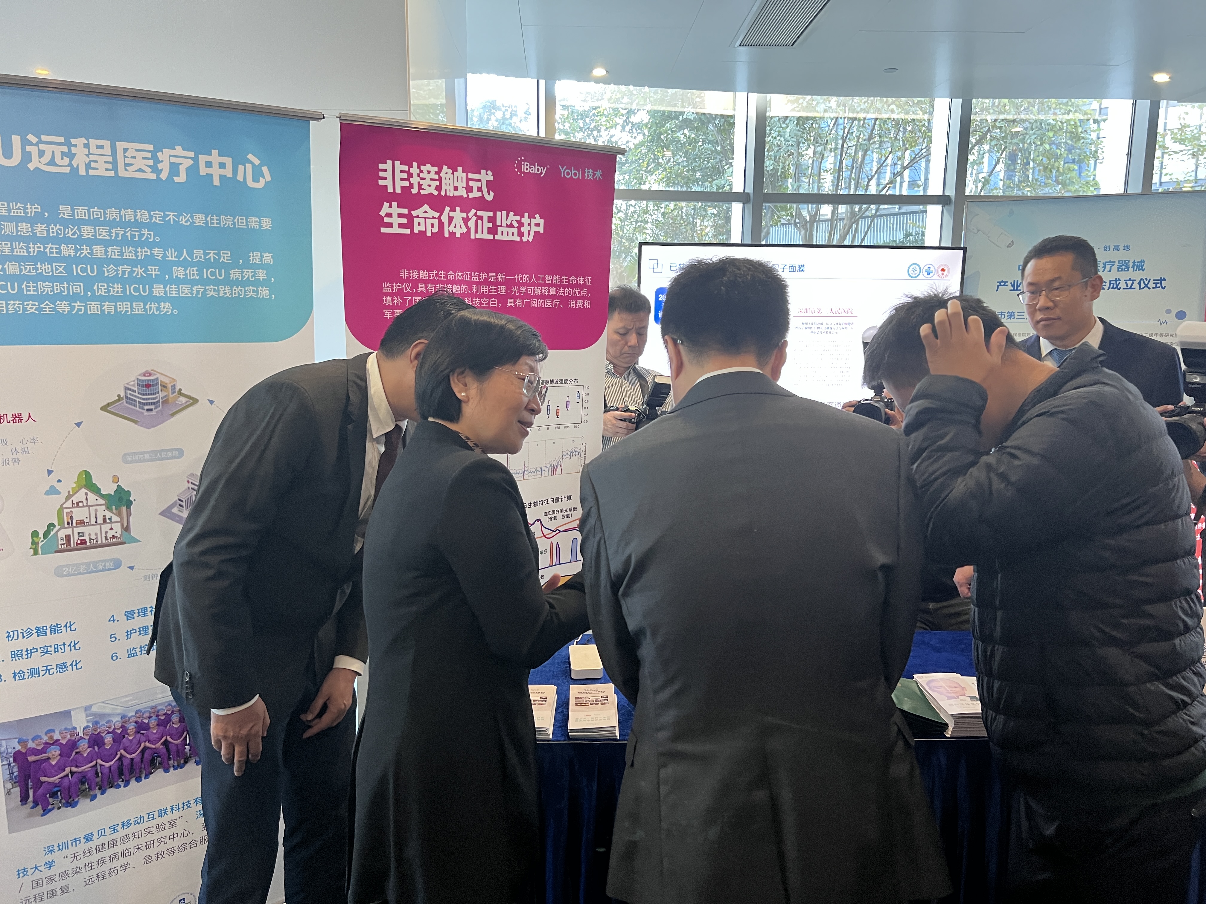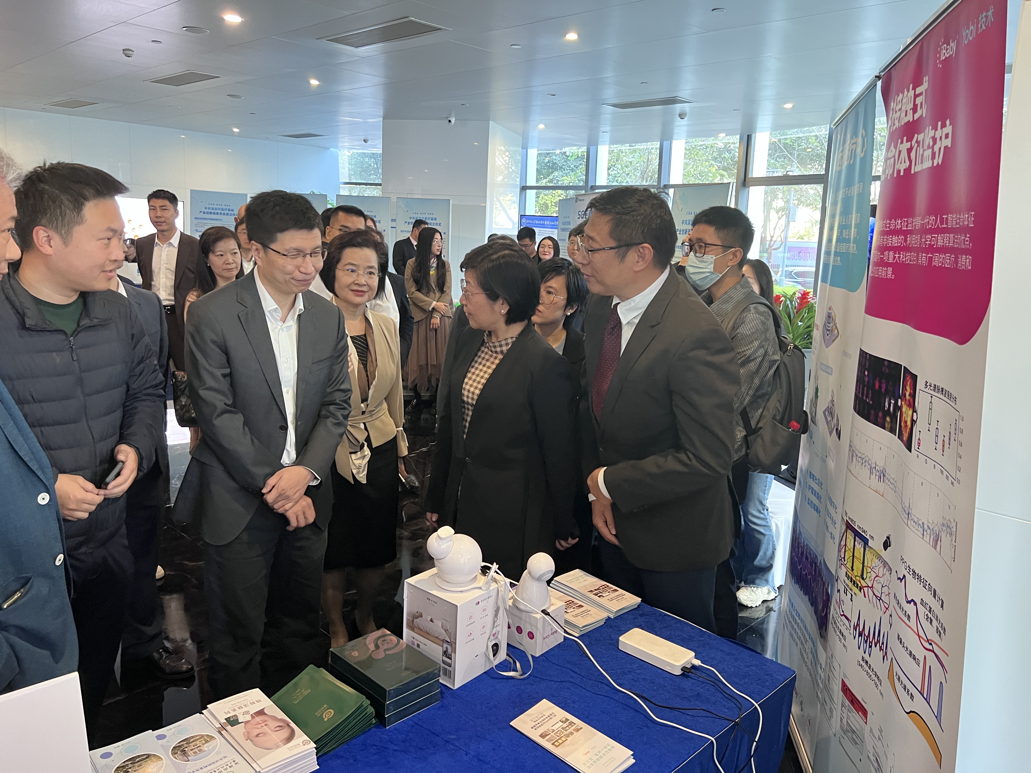 ? ? ? ?隨后,程步一部長參觀了深圳市醫工交叉創新的代表性成果,深入了解并親自測試了我系研發的“非接觸生命監護儀”產品。在此期間,他關切詢問了產品中監測指標、監測精度等專業問題,并給予了團隊鼓勵,強調應加強醫工創新落地,加快原創研究成果的臨床轉化。我系研發負責人也就科研進展和當前發展中面臨的挑戰與程部長進行了深入交流。