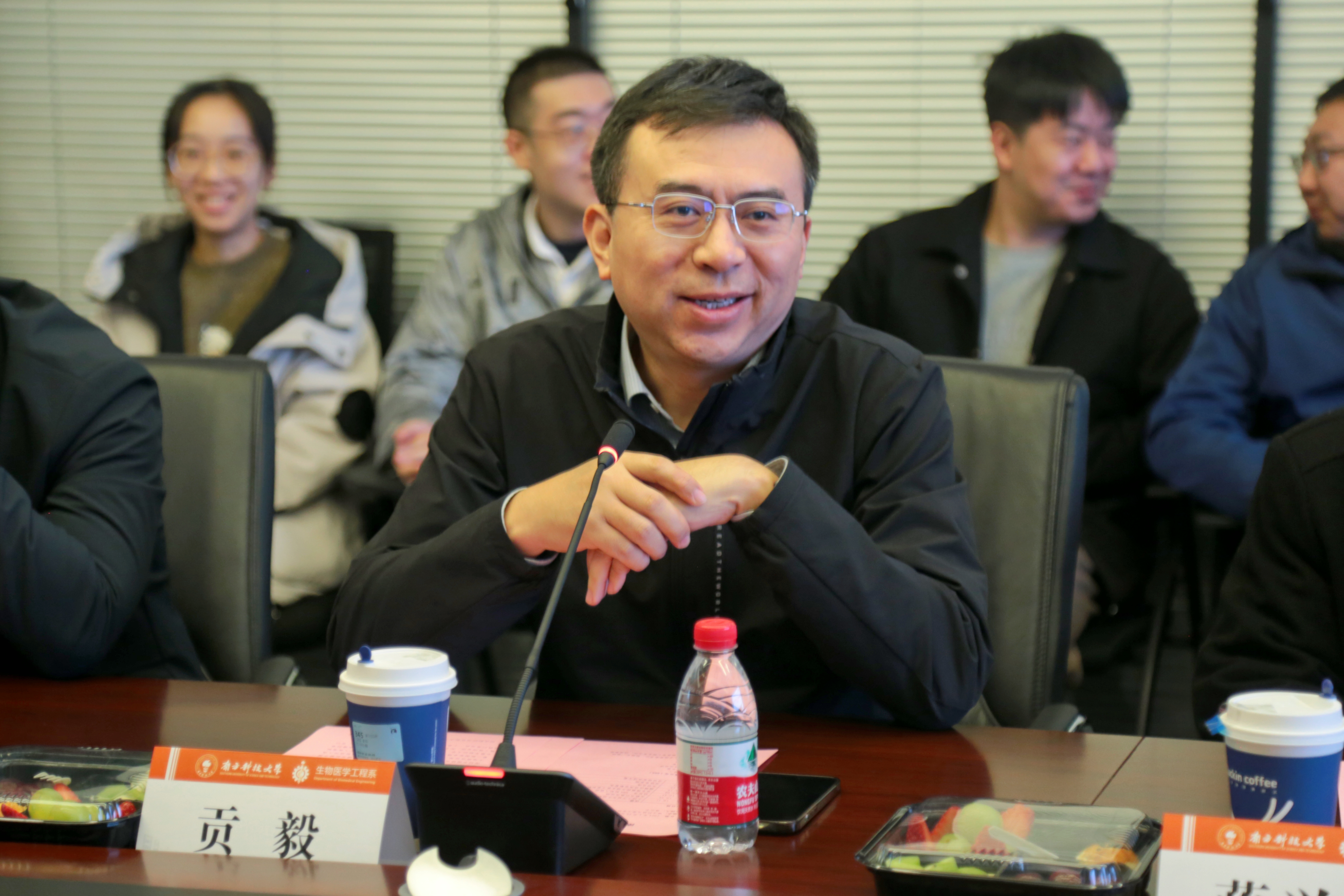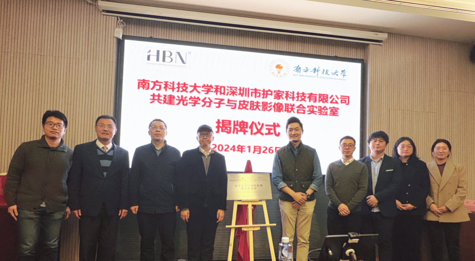 ? ? ? ?2024年1月26日,南方科技大學-深圳市護家科技有限公司 “光學分子與皮膚影像聯合實驗室”在我校工學院正式簽約揭牌。?深圳市護家科技有限公司(以下簡稱“護家科技”)HBN創始人兼CEO姚哲男,產品研發總監舒鵬,項目轉化經理張燚,我校工學院黨委書記貢毅,生醫工系系主任蔣興宇,系黨委書記吳德成,副系主任吳長鋒等出席簽約儀式。會議由蔣興宇主持。